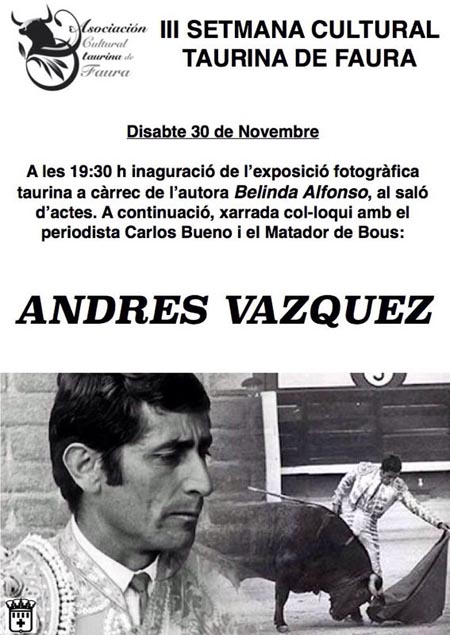 El pasado sábado, 30 de noviembre, se llevó a cabo la tercera Setmana Cultural Taurina organizada por la Asociación Cultural Taurina de Faura. La jornada comenzó a las 19:30 horas con la inauguración de la exposición El mon taurí a Faura de Belinda Alfonso Beltrán.